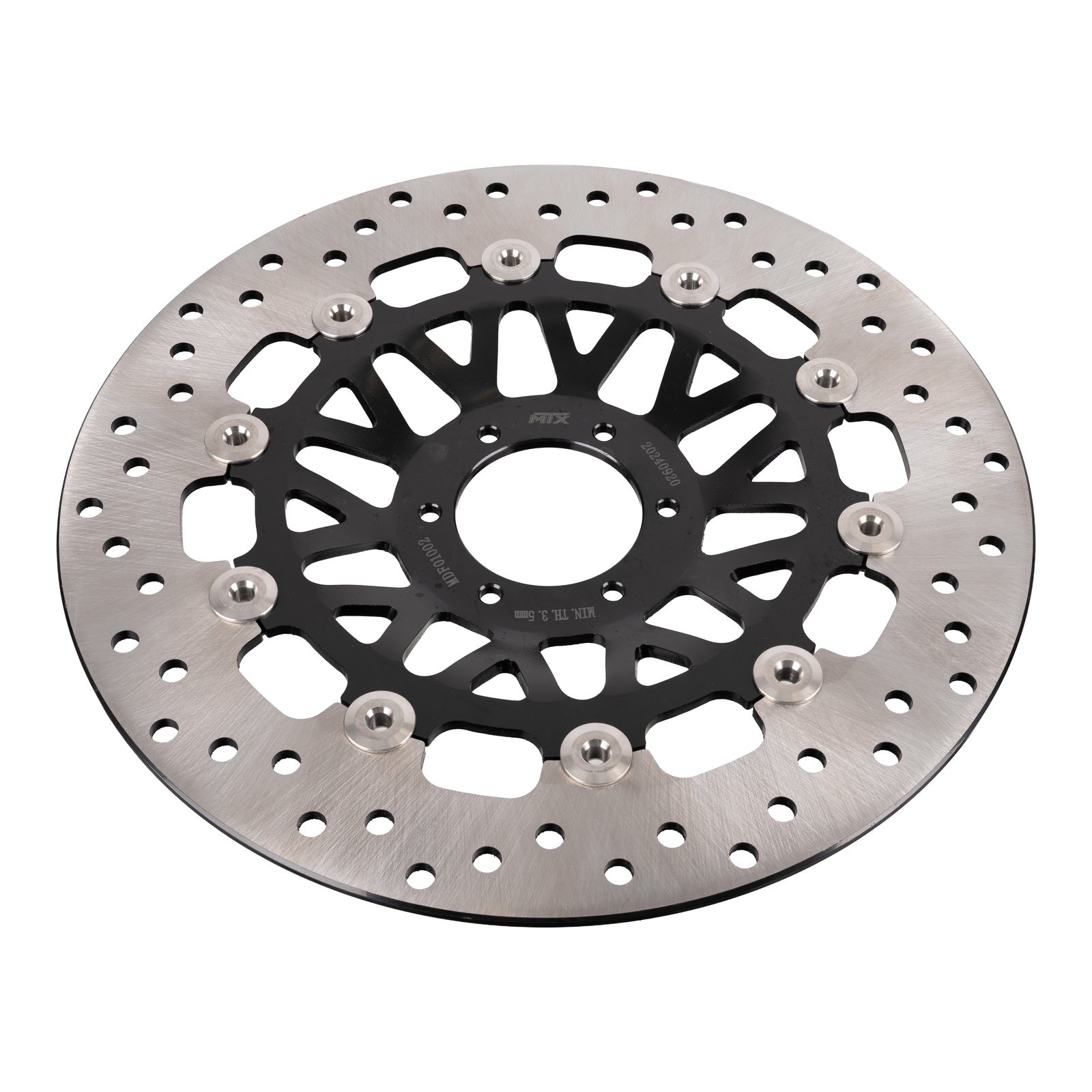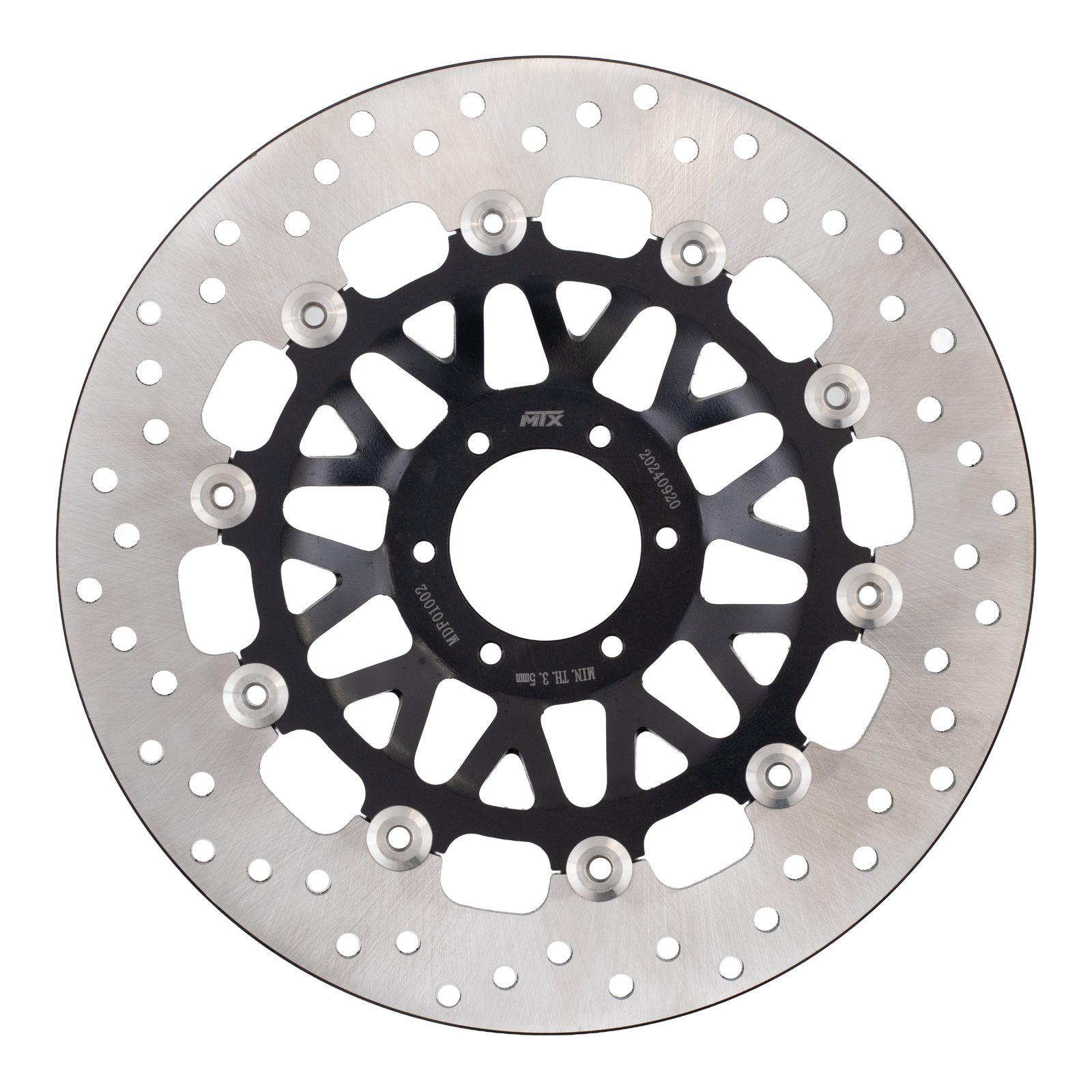 Regular price $451.98MTX floating discs are made from two segments of stainless steel which are riveted together to allow the outer section of stainless steel to expand under extreme temperatures. The outer section is manufactured from Japanese SUS 420 stainless steel, then heat-treated to HRC 36+-2 while the centre of the disc is manufactured from steel or alloy. An alternative to large original discs, floating discs improve braking performance by ensuring the disc is always in perfect alignment with your pads for the perfect contact throughout all operating temperatures. Lightening and drill holes are designed to improve braking performance and reduce the disc temperature.